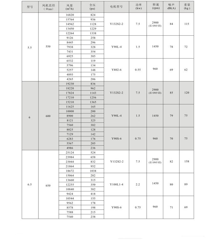 SWF(HLF)系列高效低噪聲混流式通風機技術(shù)參數(shù)表